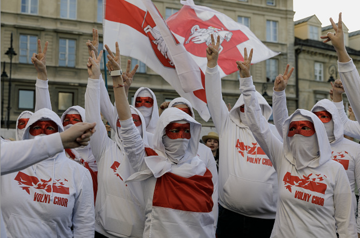 Image Credit: Volha Shukaila/SOPA Images/LightRocket via Getty Images — Volny Choir performs in Warsaw before Belarusian leader Sviatlana Tsikhanouskaya, her husband and former political prisoner Siarhei Tsikhanouski, and the Belarusian diaspora, June 26, 2025.